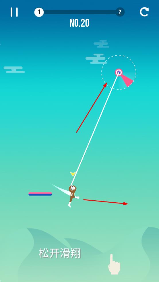 1、操控角色连接上方节点,调整绳索角度,松开触发滑翔,借摆动跨越空间,开启关卡挑战。