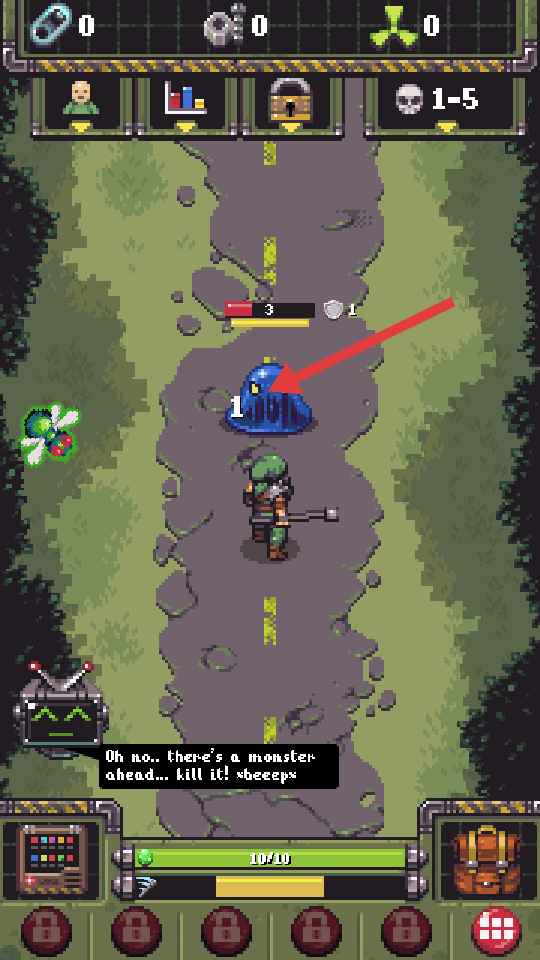 2、前行遇蓝色怪物,根据提示前面有一个怪兽,要操控角色靠近进行屏幕点击攻击,熟悉战斗操作。