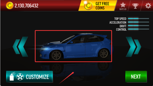 2、进入车库浏览20余款定制跑车,根据性能参数与外观偏好选择参赛车辆。