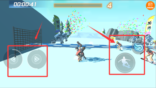 1、核心操作采用重力感应控制方向,左侧虚拟按键控制加速,右侧发射雪球。长按屏幕可进入专注模式,提升雪球命中精度但会持续消耗耐力值。