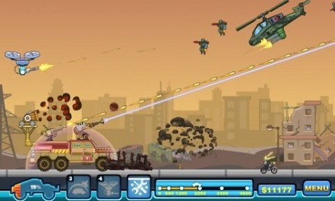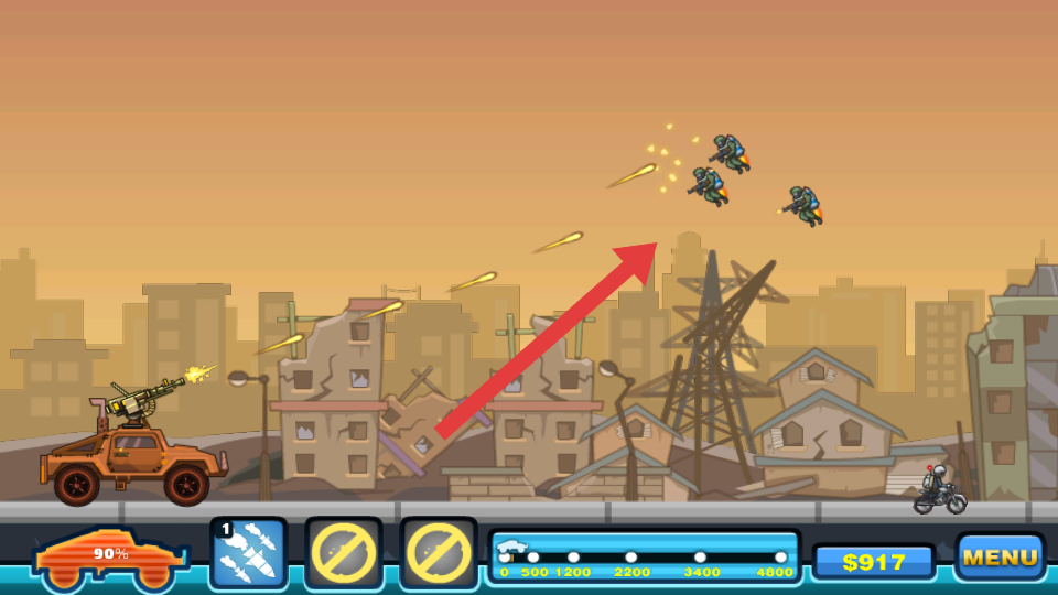 3、面对多波空中敌人,合理把握战车行进节奏,利用金币升级武器威力,高效清理敌人,推进关卡进程。