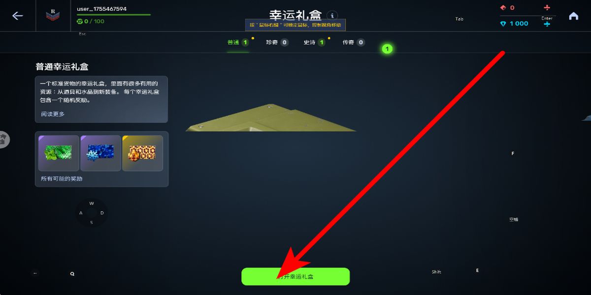 1、进入幸运礼盒界面,先确认普通礼盒内资源详情,当满足开启条件时,点击下方绿色按钮,获取随机奖励,为前期发展积累道具,提升基础配置水平。