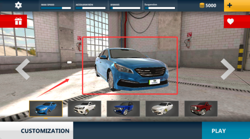 1、进入车库界面浏览各类越野车型,通过左右滑动查看详细参数,选定适合沙漠地形的座驾。