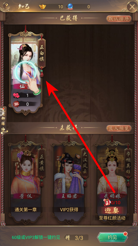 1、在主界面点击知己建筑,进入知己系统,可查看已获得和未获得的知己,已获得的如正白旗仙蕊,未获得的有武媚娘等,按需参与获取途径。