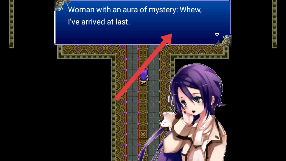 1、进入游戏,操控紫发角色前进,遇到对话如神秘女性终于抵达,点击继续推进剧情,熟悉场景互动。