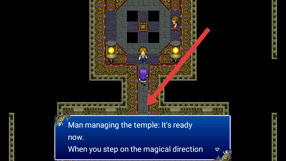 3、到达神庙区域,与管理男子对话,得知需踏上魔法方向,寻找并踩踏场景中特殊标记,推进流程。