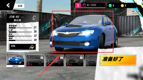 2、进入车库浏览各款赛车性能参数,左右滑动查看详细数据,选定参赛座驾。