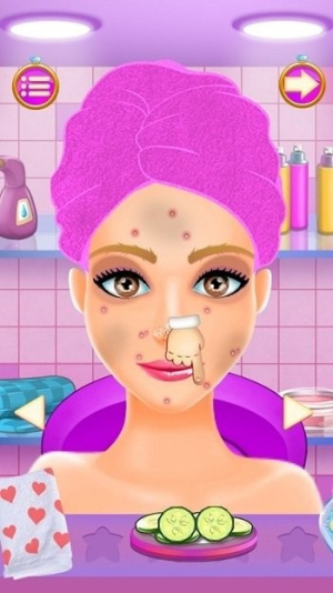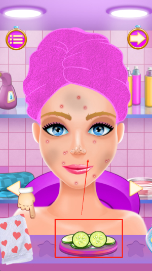 3、开始装扮:在装扮界面,点击选择道具,如黄瓜片,开始对新娘进行面部护理。