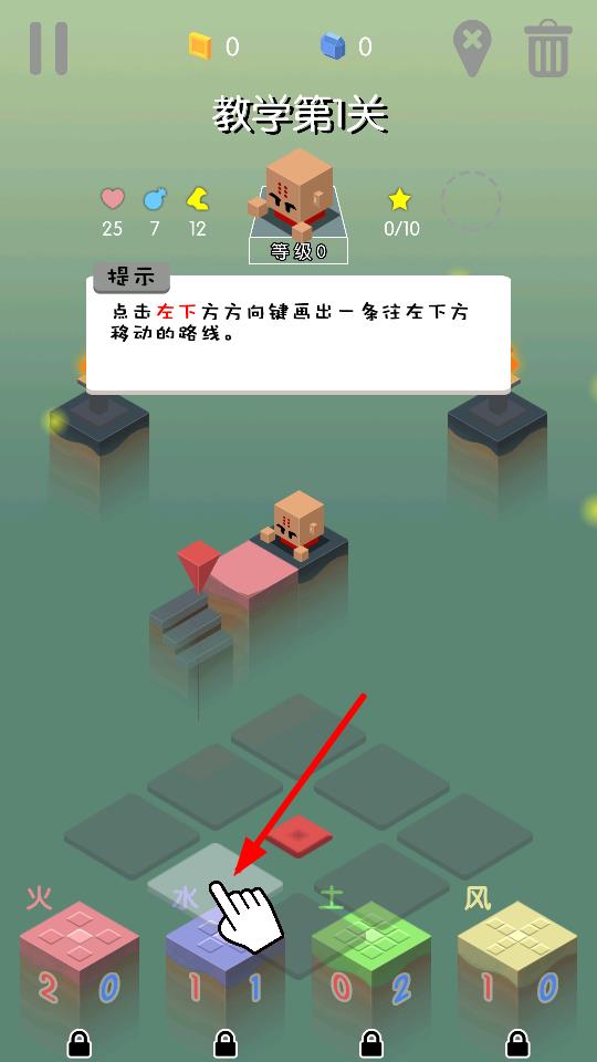 1、在教学第1关根据提示点击左下方方向键,按要求画出一条往左下方移动的路线,熟悉基础移动操作,开启游戏之旅。