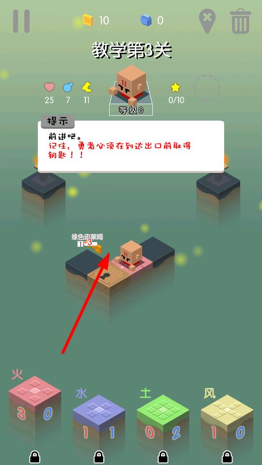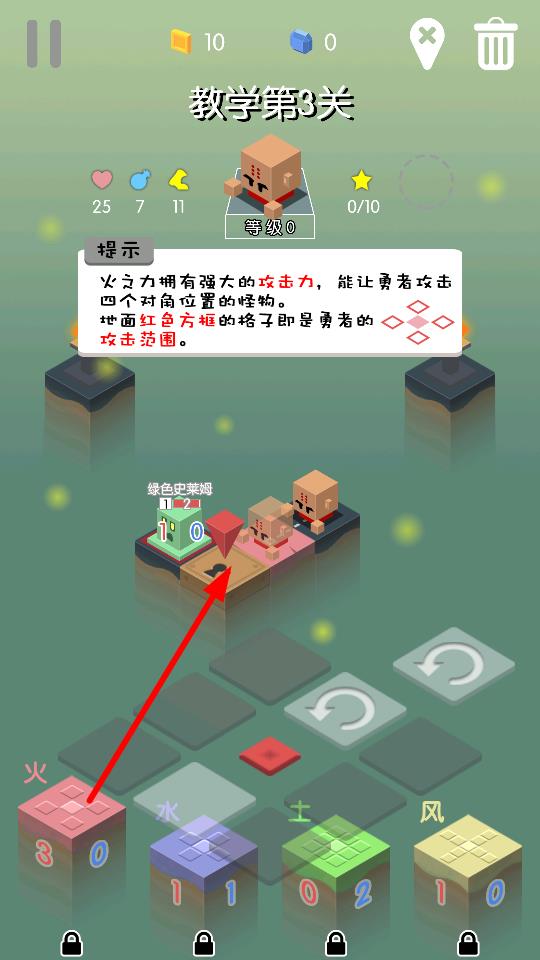 2、了解火之力的特性,其拥有强大攻击力,可让勇者攻击四个对角位置的怪物,合理利用火之力应对绿色史莱姆等怪物。