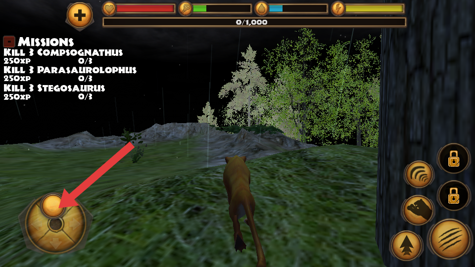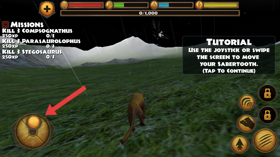 1、跟随教程指引,通过左下角摇杆或滑动屏幕操控剑齿虎移动,点击TAP TO CONTINUE跳过引导。