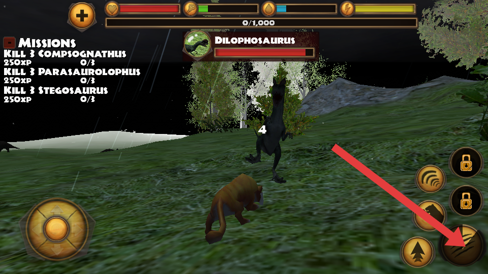 3、靠近恐龙如双脊龙后,点击右侧解锁的攻击的按钮爪击、撕咬等战斗,要注意观察血量、耐力。