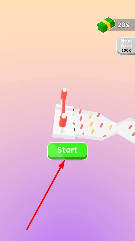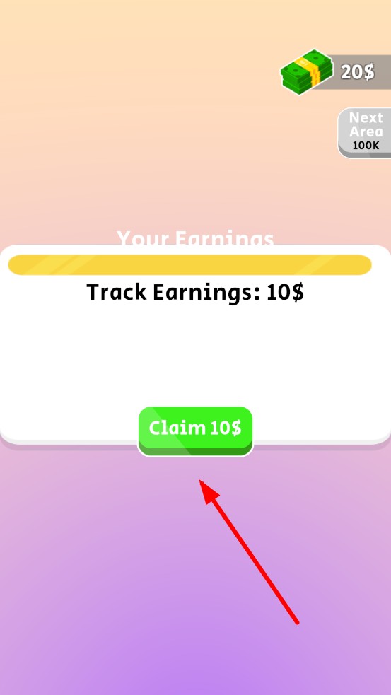 3、完成赛道后,弹窗显示本次收益,点击收集按钮,领取十个金币,积累资金可解锁右上角Next Area新赛道区域。