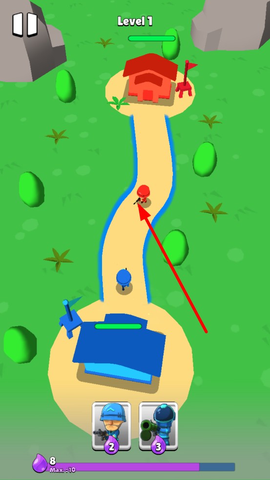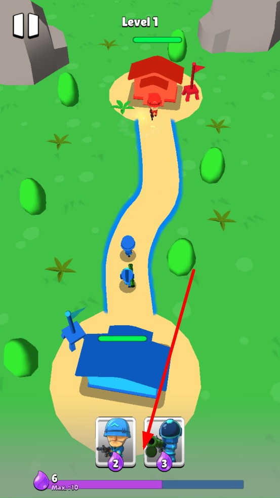 1、开局蓝方基地持续产出紫色水滴资源,优先点击2级步兵卡牌,沿固定路线向红方建筑推进。