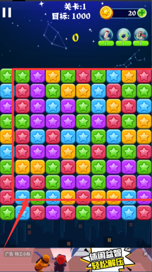 1、进入关卡后先观察星星分布,找颜色相同且相邻的两个以上星星,点一下就能消除,为后续落下创造机会。