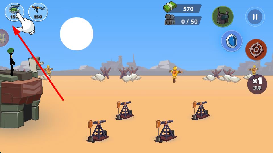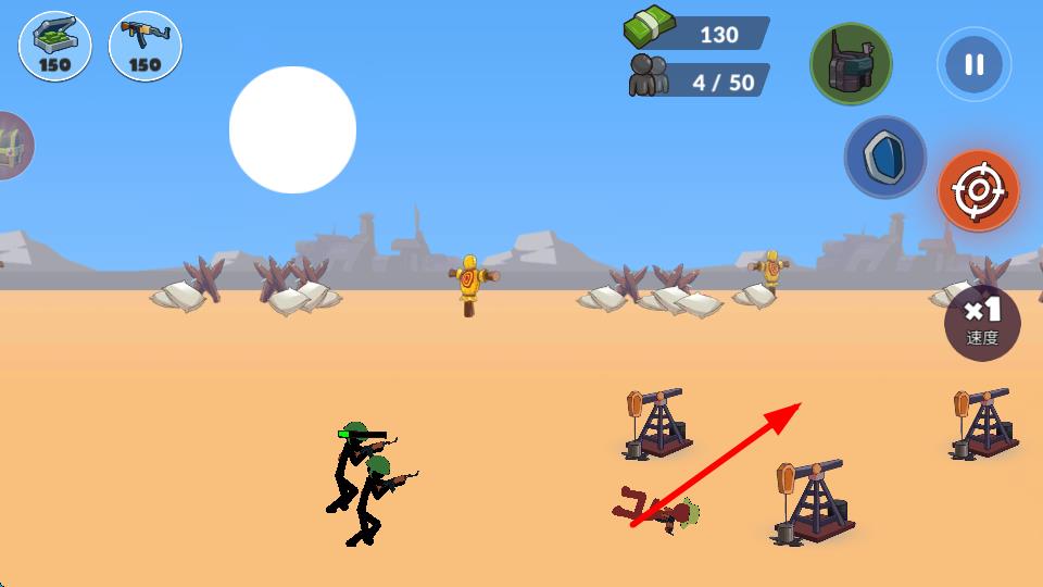 2、选择战役场景进入战斗,操控火柴人部队在战场上移动,点击目标发动攻击,利用地形掩护躲避敌方伤害,适时释放技能击溃敌人。