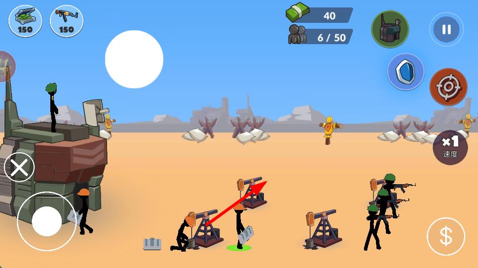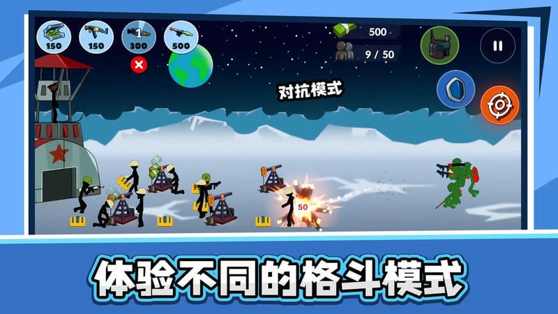 3、火柴人养成体系:士兵分为近战、远程、辅助等多种类型,可通过训练提升等级、学习技能,搭配不同装备改变战斗风格打造个性化的战斗部队。