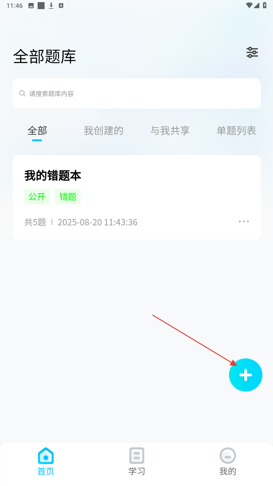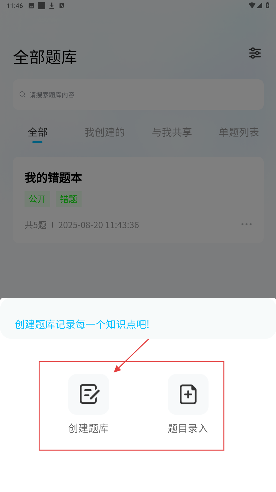 1、进入【全部题库】界面,可利用搜索找内容,点右下角+号,选创建或录入题目。