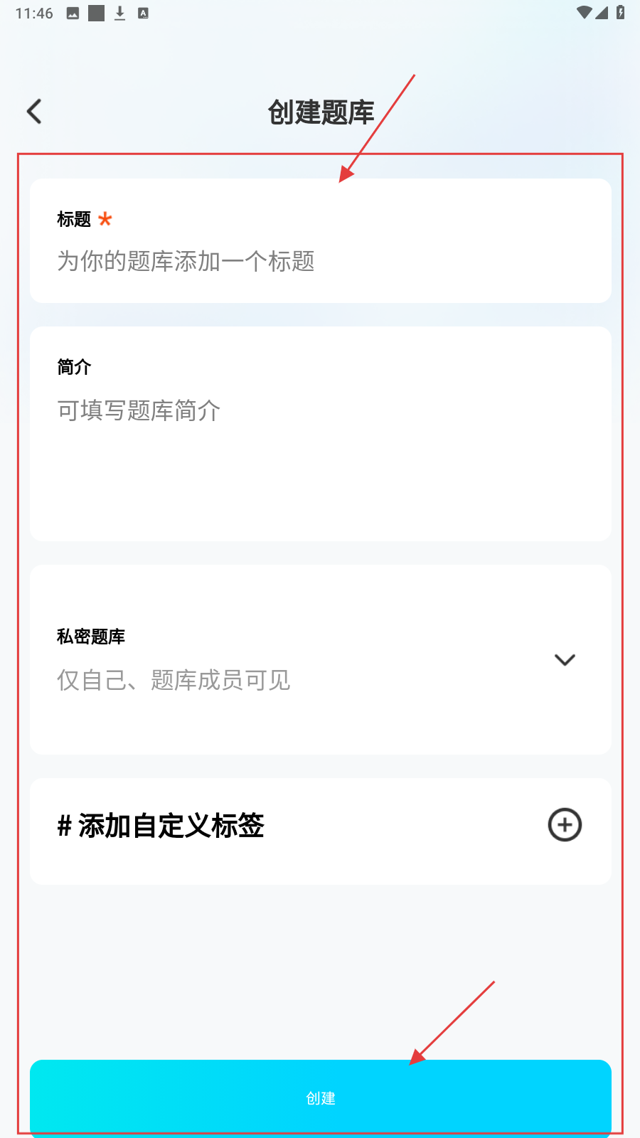 3、在创建题库页,填好标题(必填)等内容后,点【创建】完成新题库搭建流程。