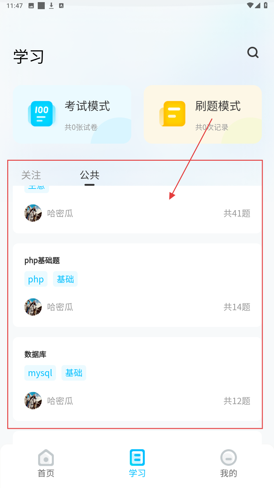 4、切换到【学习】页,选【刷题模式】,在公共题库列表选感兴趣的,如【php基础题】开始练习。