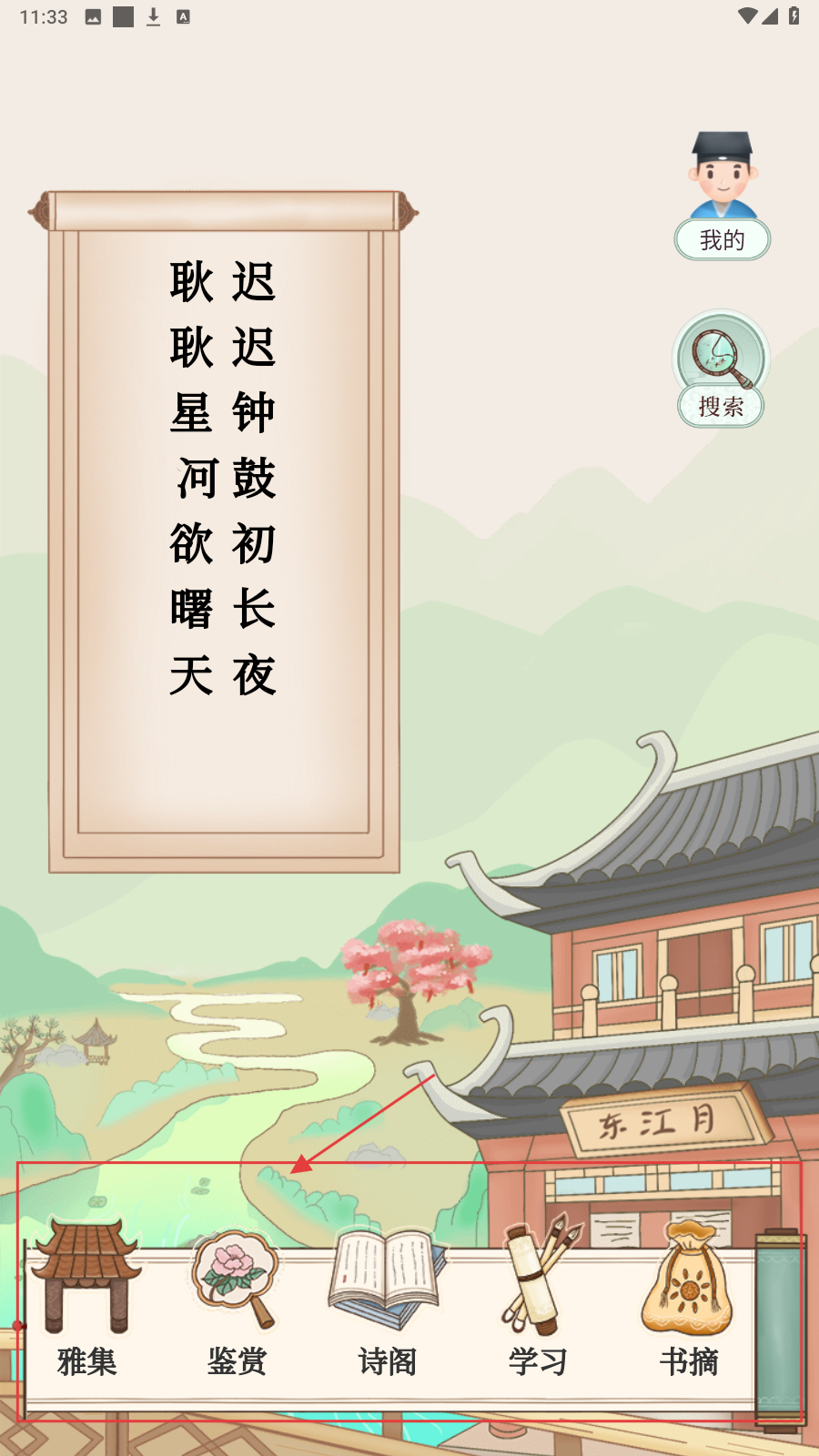 1、进入主界面,利用底部【雅集】【鉴赏】等入口,开启诗词探索,选对应模块体验。