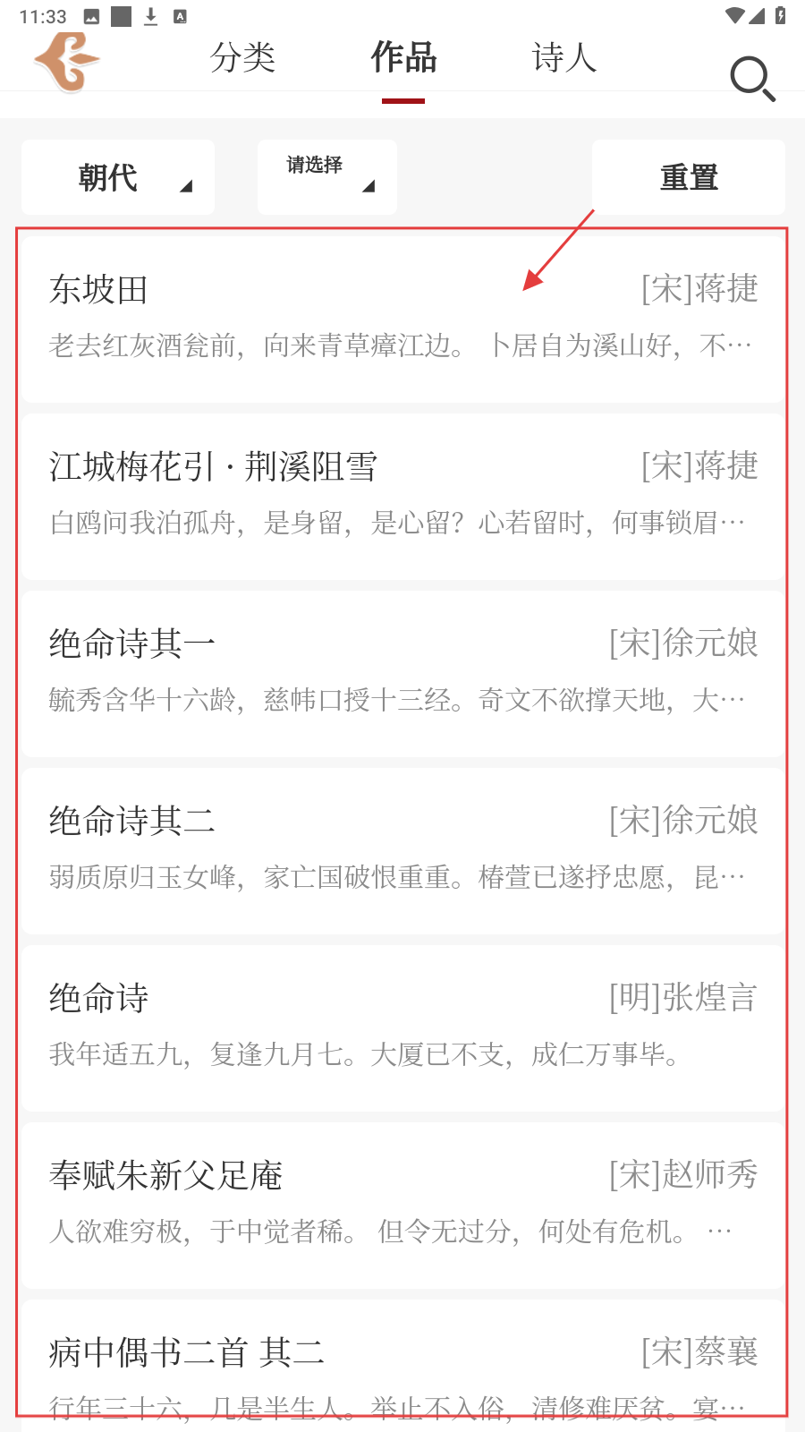 2、在作品列表,点击感兴趣诗词标题,如【绝命诗】,查看基础诗词内容。