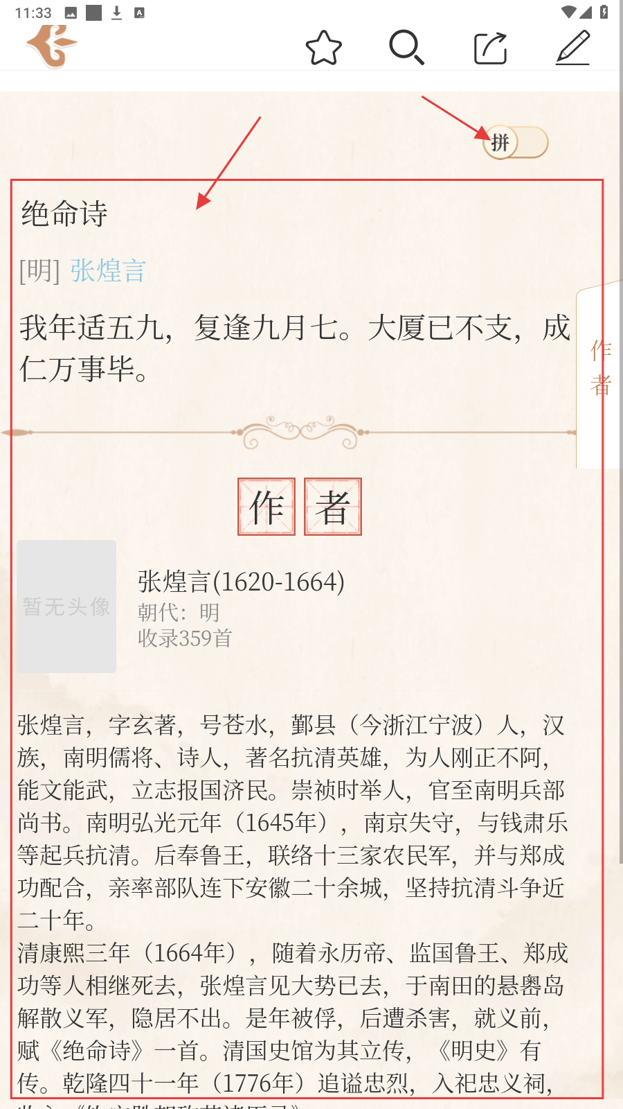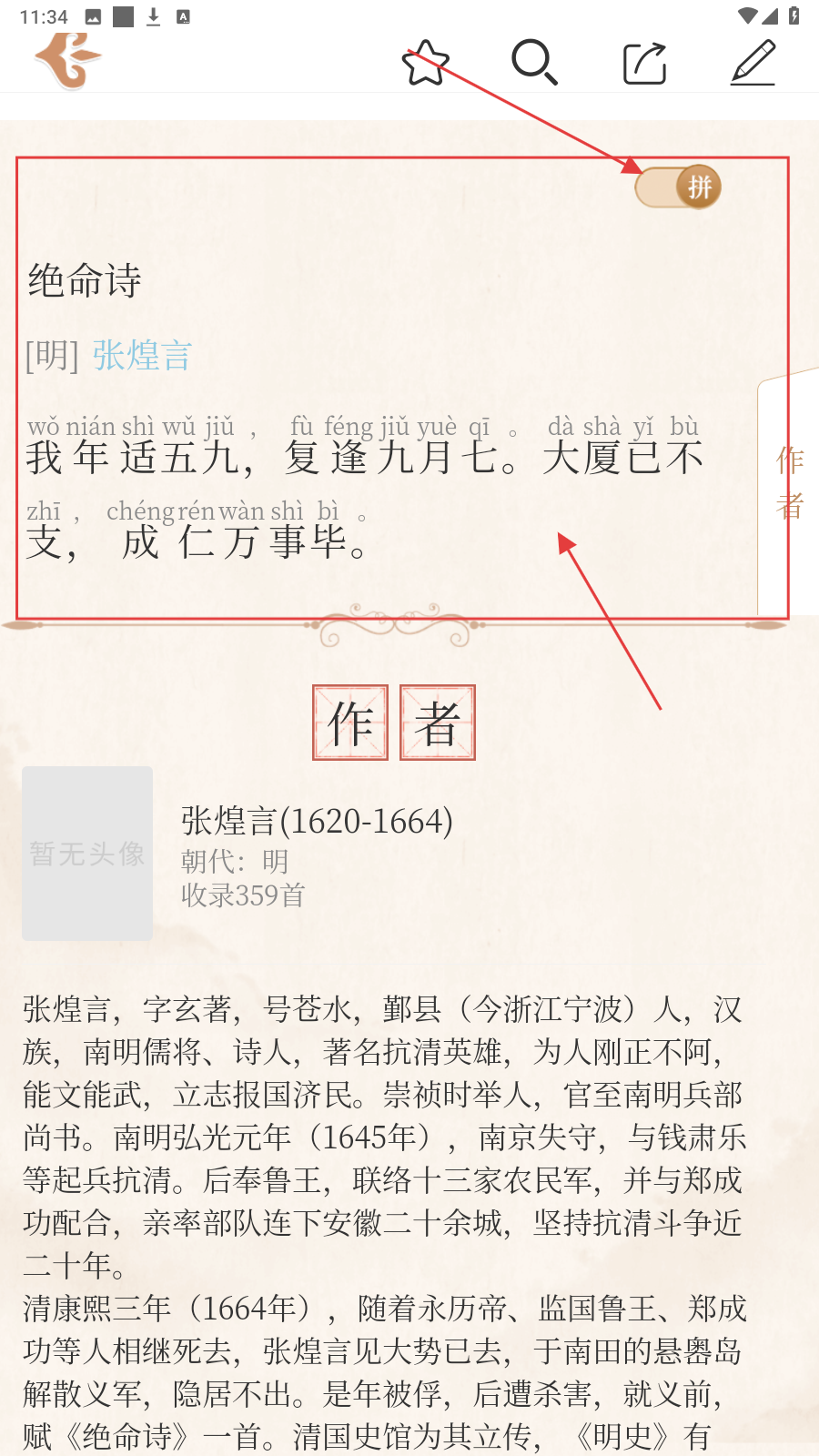 4、点击右上角【拼】按钮,即可带拼音显示,辅助诵读诗词,解决生僻字读音,助力字词学习。