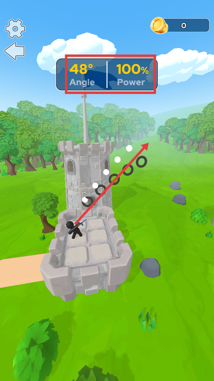 2、调整【角度-48°】【力度-100%】,瞄准城堡外敌人,发射箭矢。