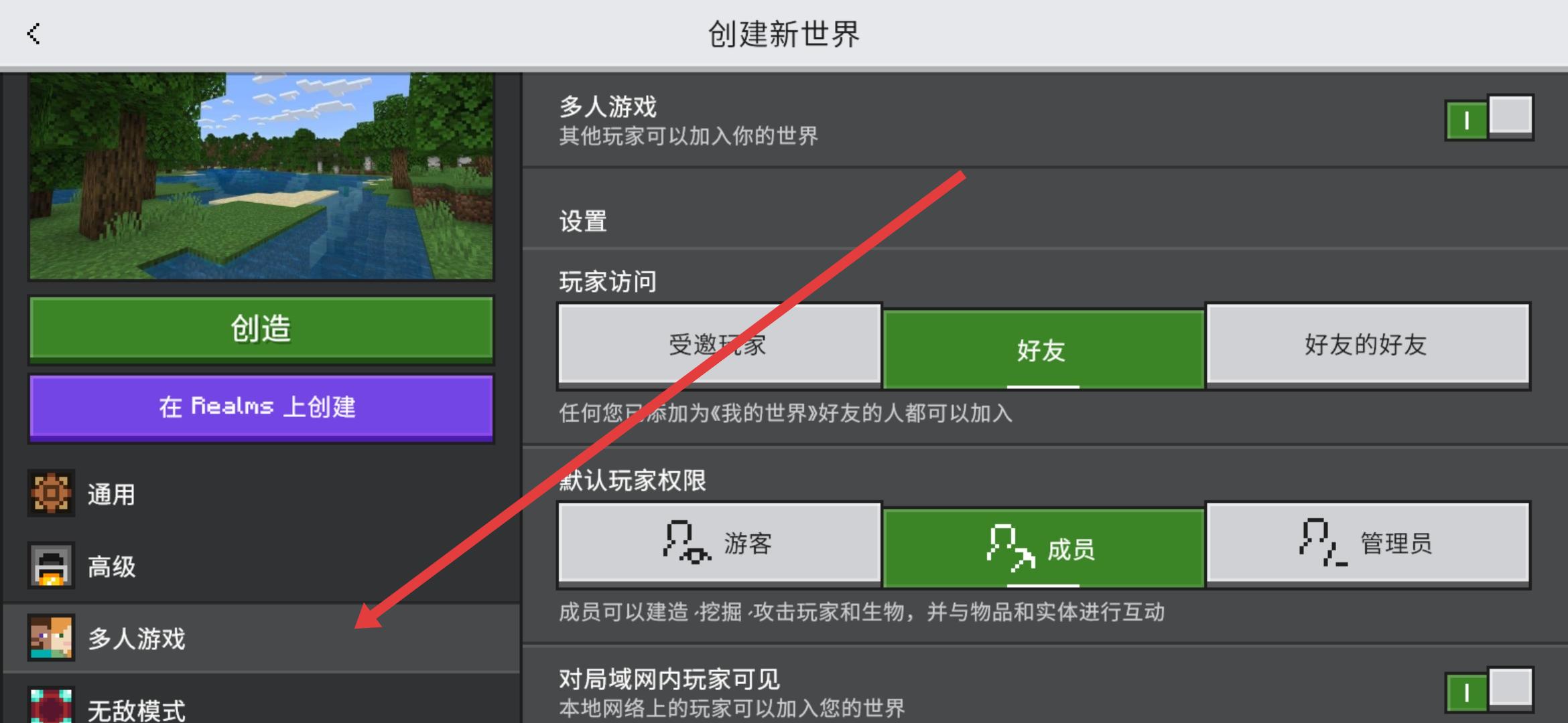 1、创建世界时,在多人游戏设置栏开启多人模式,选择玩家访问权限如好友可见,为好友加入开放权限。