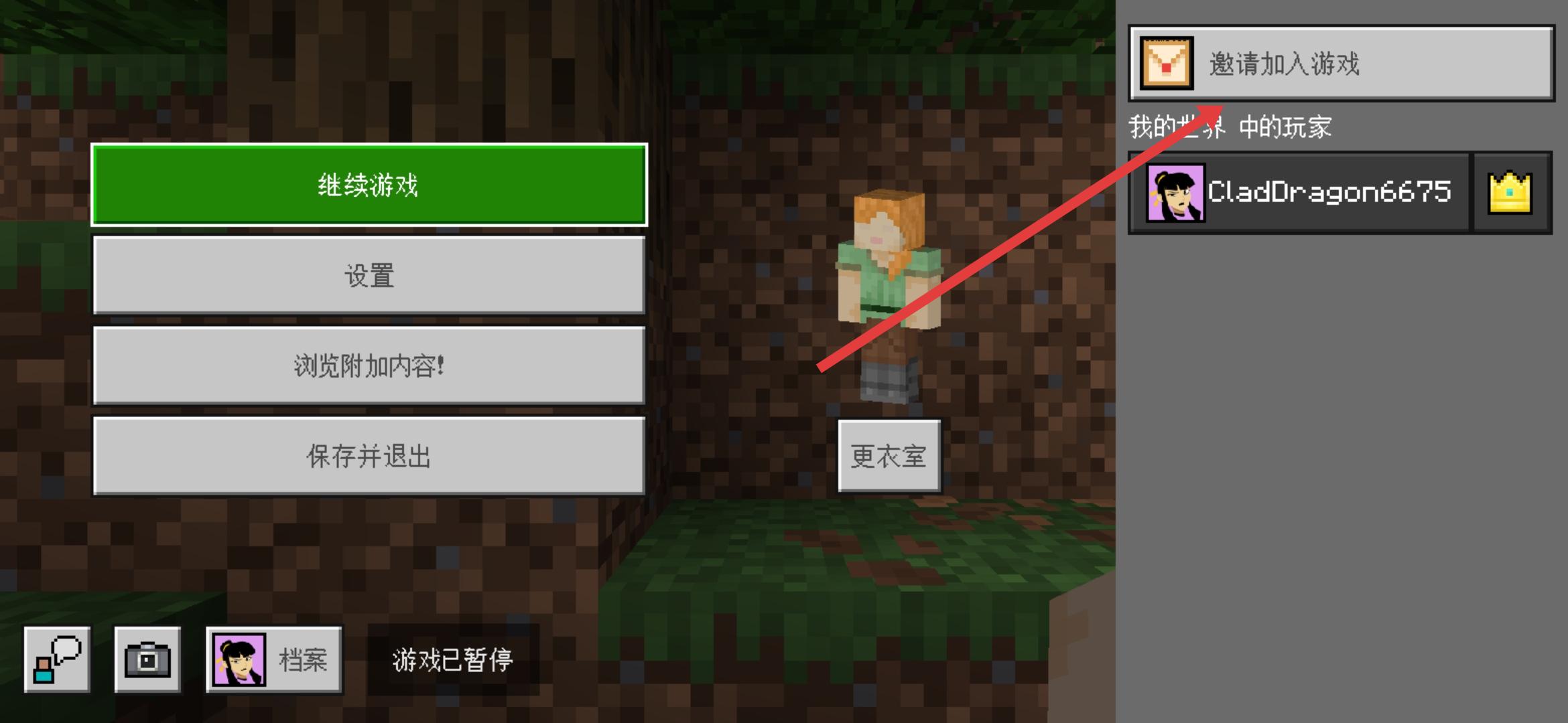 2、进入已创建的世界后,按Esc暂停游戏,点击右侧邀请加入游戏按钮,启动好友邀请的流程。