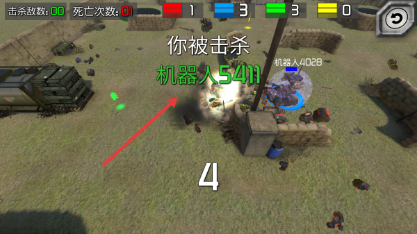 2、用左摇杆操控机器人移动,右摇杆瞄准敌人射击,优先攻击敌方机器人,同时注意躲炮火。