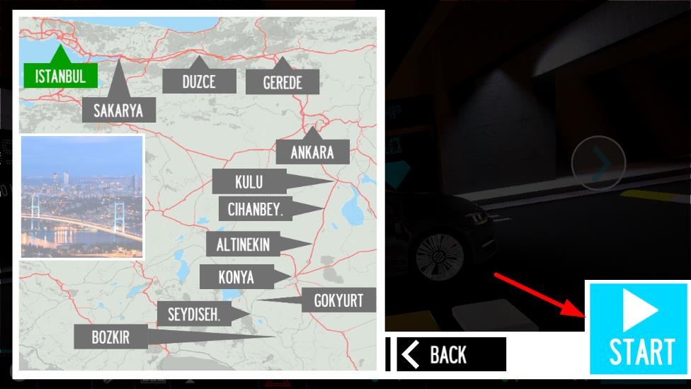 1、进入游戏后,在车库选择合适的赛车,进入赛道界面挑选竞速地图,点击开始按钮启动车辆,准备迎接竞速挑战。