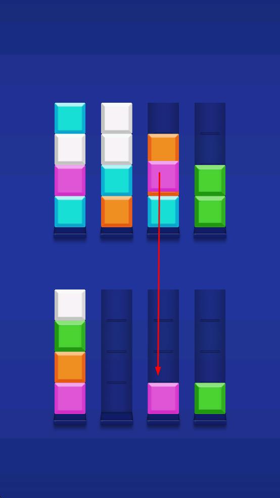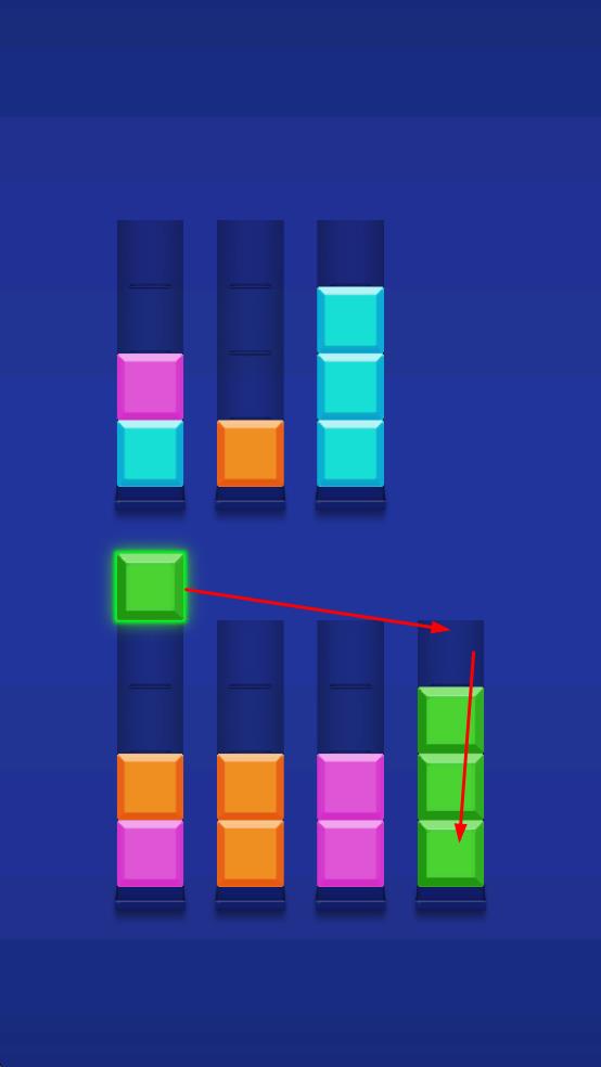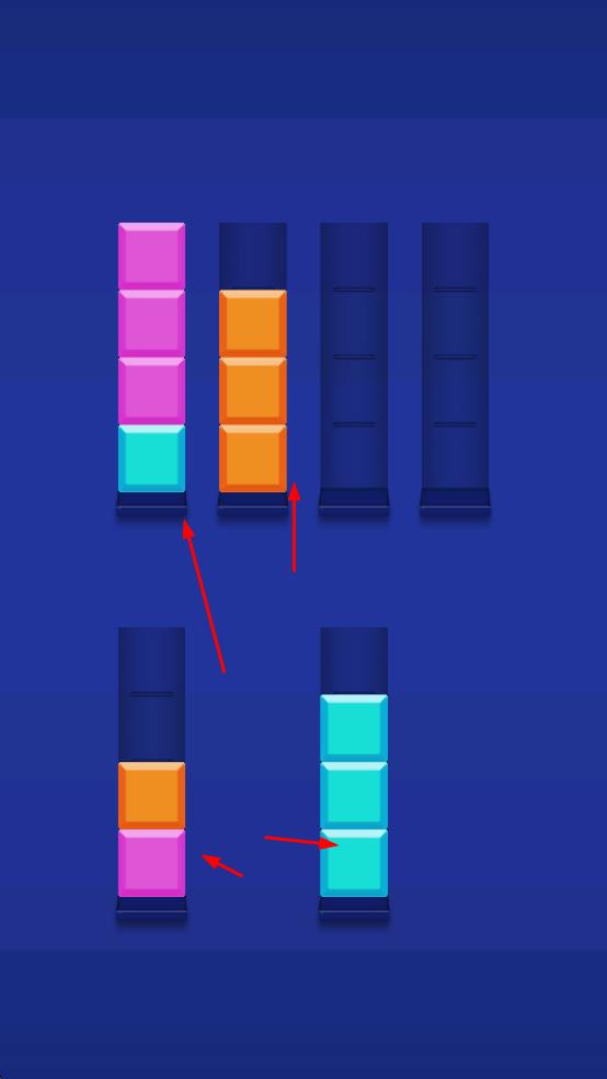 1、点击彩色方块,将其移动到同色的竖列中。