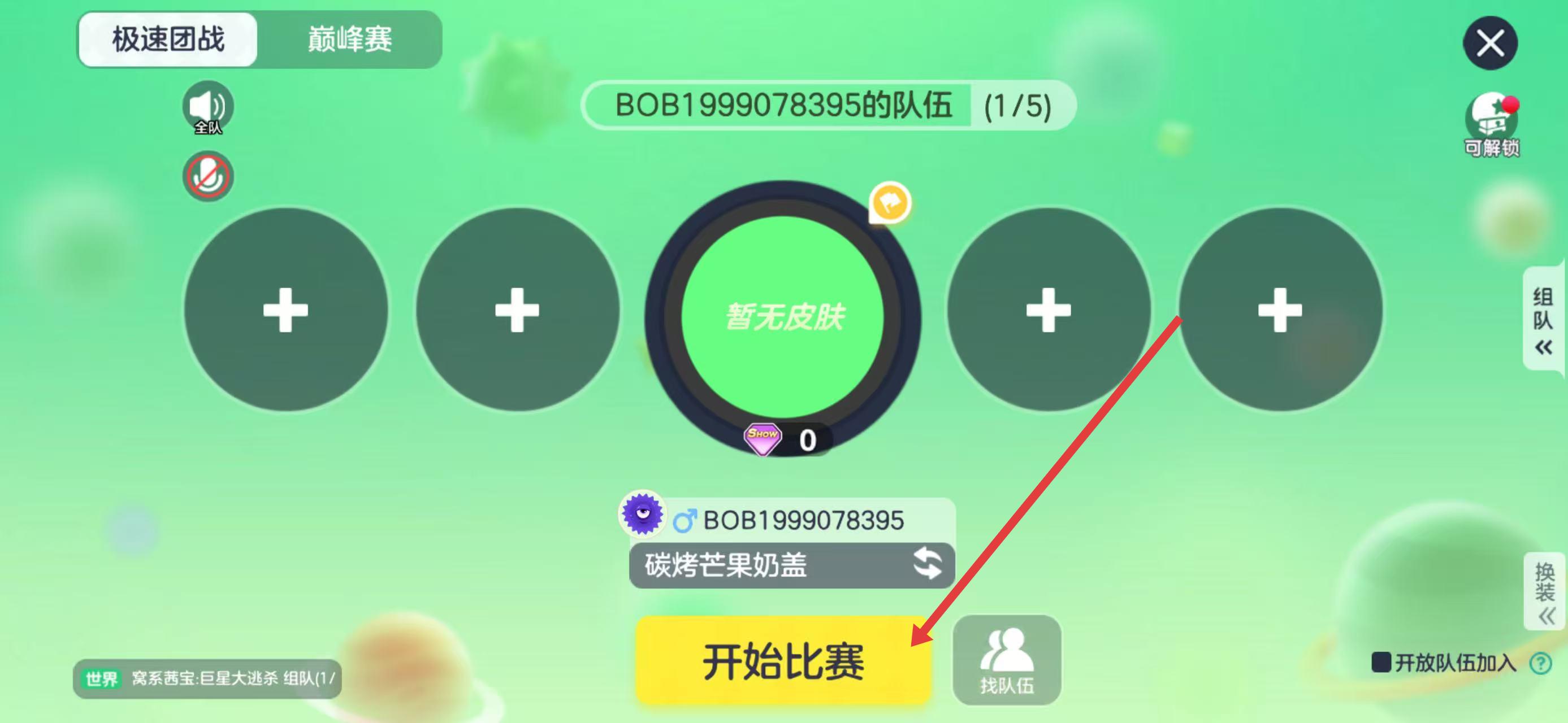 2、在极速团战组队界面,可点击加号邀请好友组队,凑齐最多5人队伍。若不组队,确认好昵称等信息后,直接点击开始比赛,快速匹配对手进入对局。