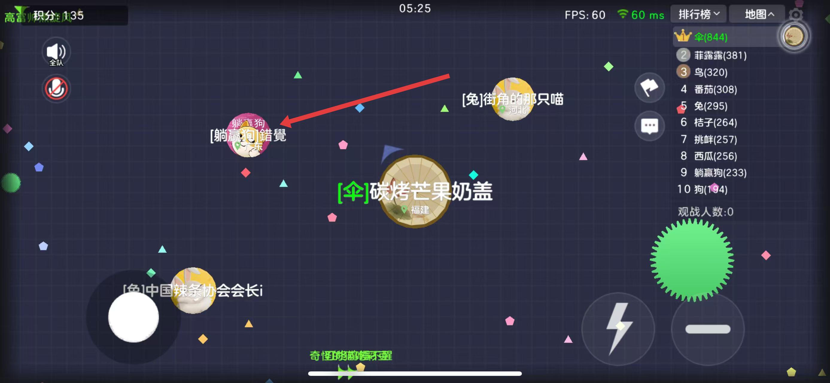3、进入游戏对局后,通过移动摇杆操控球球,吞噬地图上的彩色小方块积累体积。同时观察排行榜,留意其他玩家的情况,找准时机吞噬比自己小的球球,壮大自身。