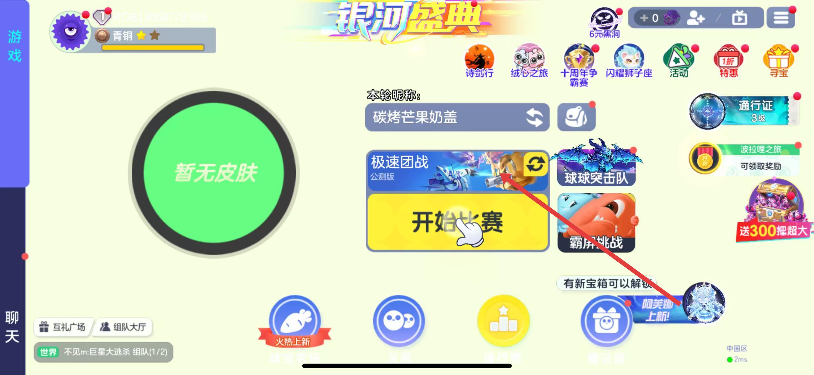 1、进入球球大作战游戏主界面,在银河盛典主题活动界面下,确认本轮昵称,点击开始比赛按钮,准备选择游戏模式。