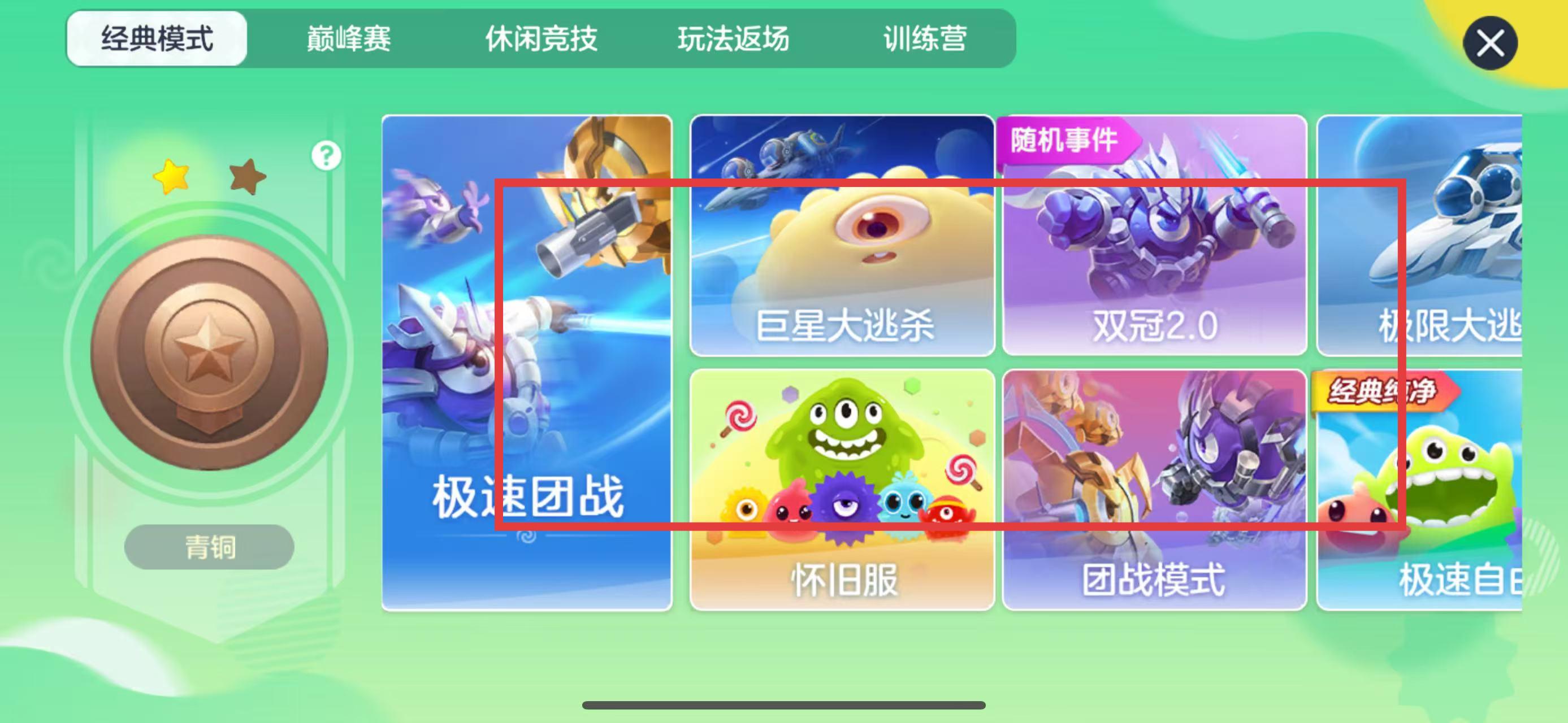 2、在模式选择界面,有经典模式、巅峰赛、休闲竞技等多个分类,可在经典模式里选择巨星大逃杀、双冠2.0等具体玩法,体验不同竞技乐趣。