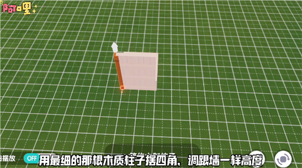 1、首先在建材库之中选择一个木桩子,调节成比墙体高的高度,并在墙体的四个角都安置上木桩子;