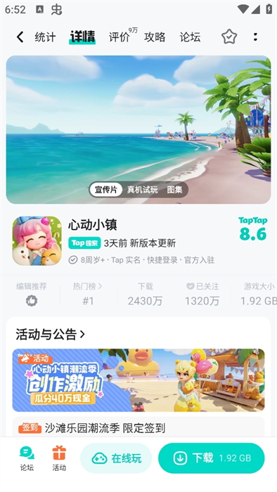 2、使用TAPTAP下载,心动小镇独家上线了TAPTAP平台,所以除了在本页面下载之外,还可以在TapTap下载,但是需要玩家先下载一个taptap才行,所以还是比较麻烦的,但是也是一种选择,提供的也是官服,可以放心下载,就算你在官网下载,也是跳转到TapTap下载的。