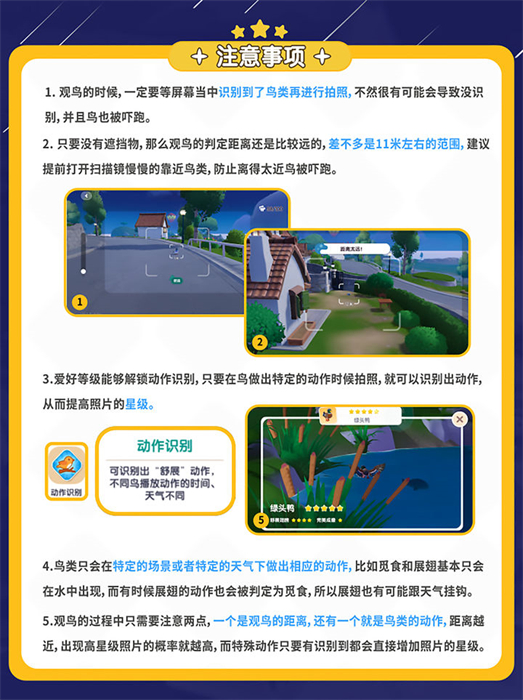 1、在拍鸟的过程中有多种不同的注意事项需要玩家留意,以下是注意事项的总结图片,玩家可以详细了解;