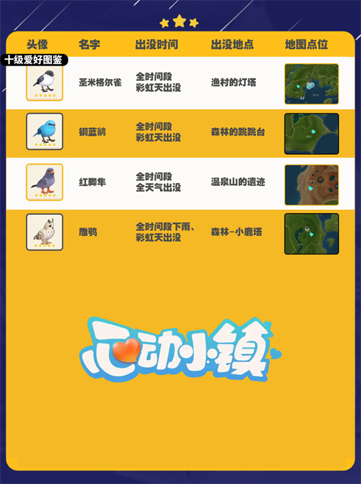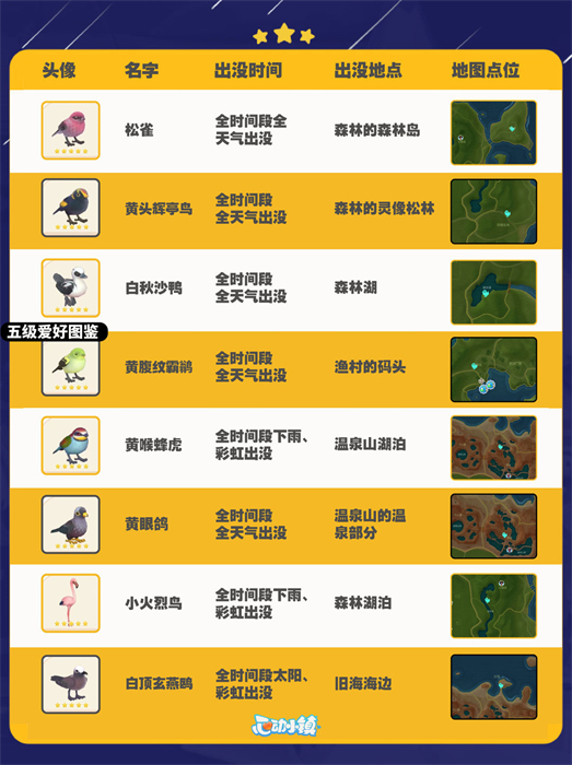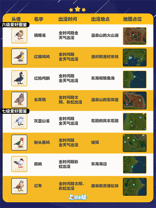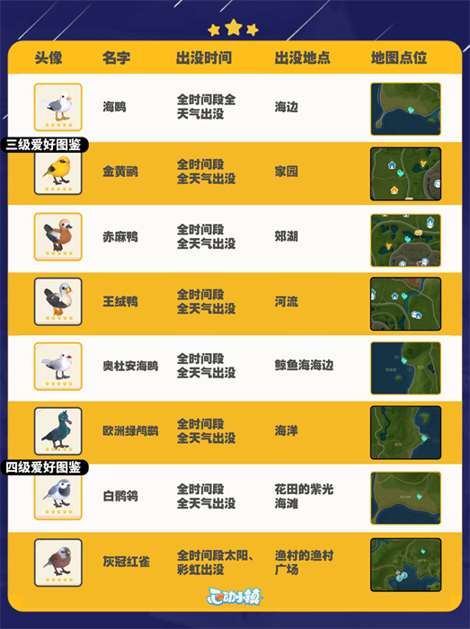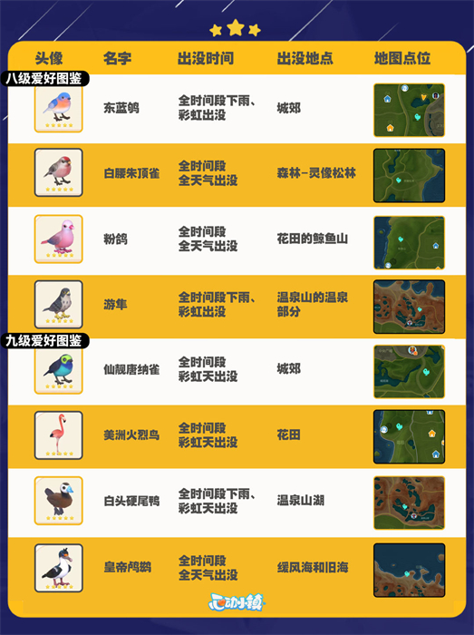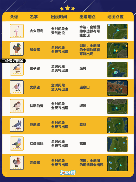 2、不同的鸟类将会有着不同的出没时间以及出没地点,且这些鸟类被拍到的价值也不同,故小编总结了以下所有不同等级鸟类的出没地点以及时间,可供玩家们更好的进行拍鸟。