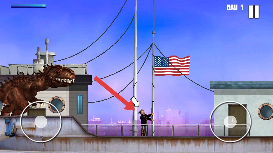 2、沿箭头指引靠近人类目标,点击攻击按钮,捕食人类积累分数,注意避开场景中可能的障碍建筑、围栏。