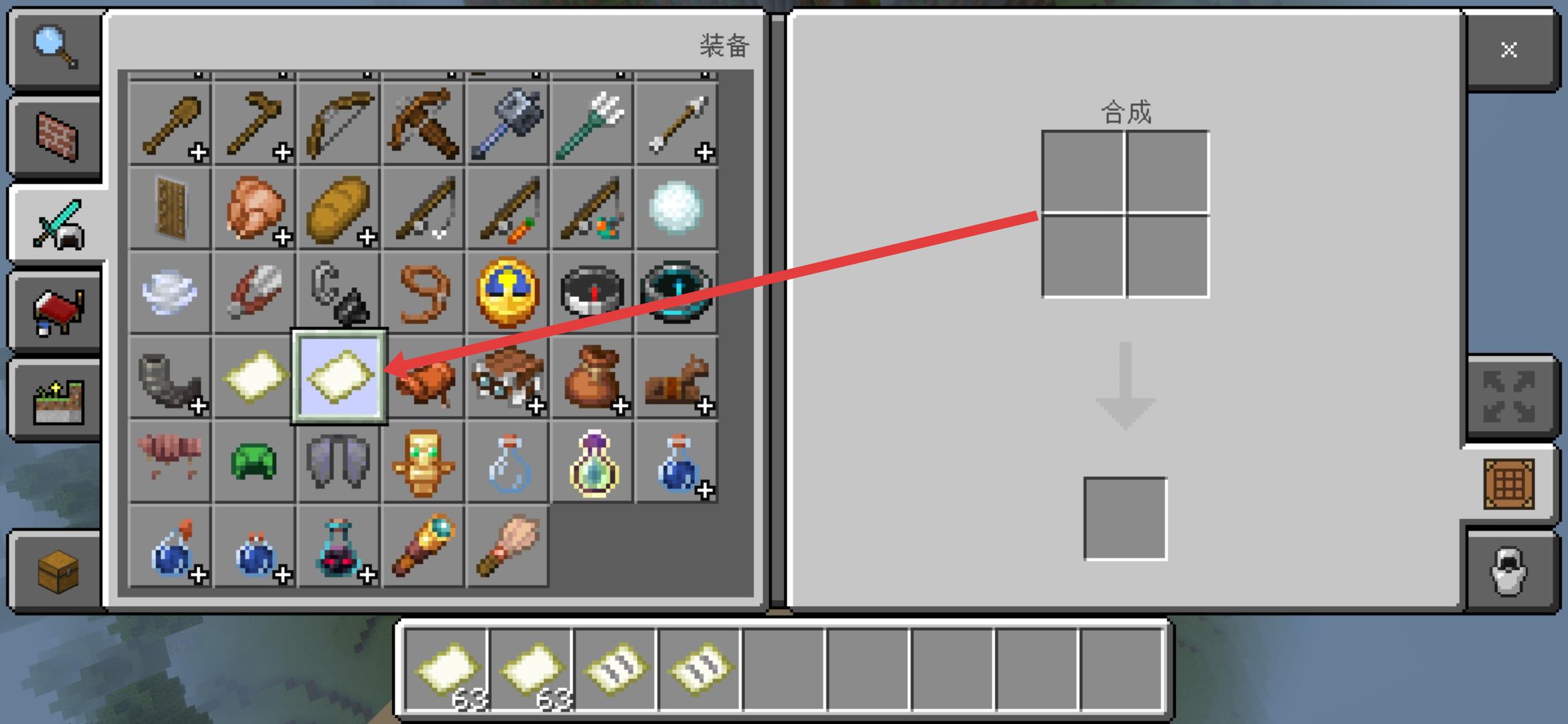 1、用3根甘蔗合成3张纸甘蔗多生于水边,4个铁锭+1个红石合成指南针,打开工作台,将指南针放中间格,周围8格放纸,合成空白地图。