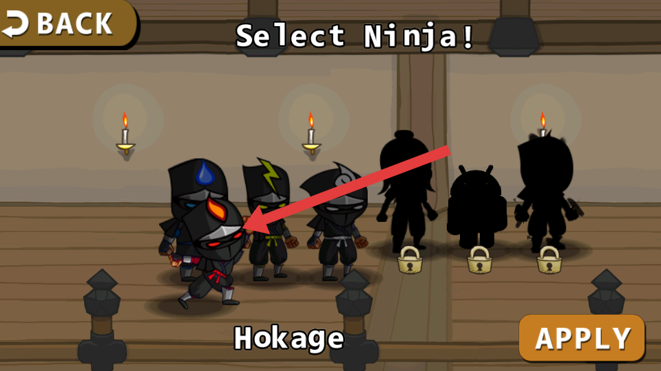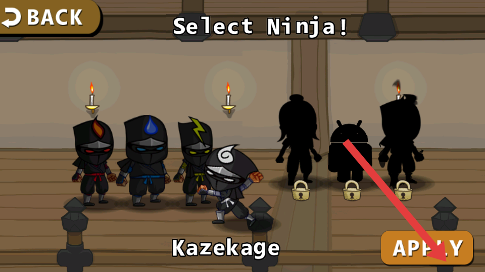 2、确定角色后,点击右下角APPLY确认角色选择,进入游戏关卡,用虚拟按键若有操控忍者跑酷、战斗。