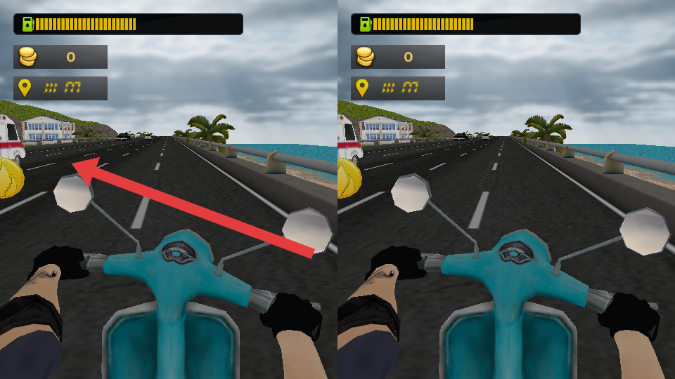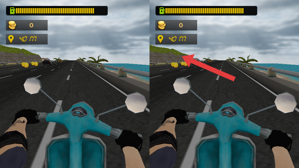 2、关注上方距离标识,每段路程有金币与车辆障碍,左右移动摩托避开汽车,保持高速行驶积累距离进度。