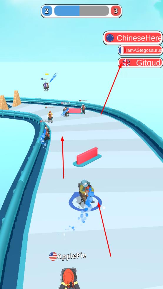 2、比赛中超越标识角色,借助赛道环境推进进程。
