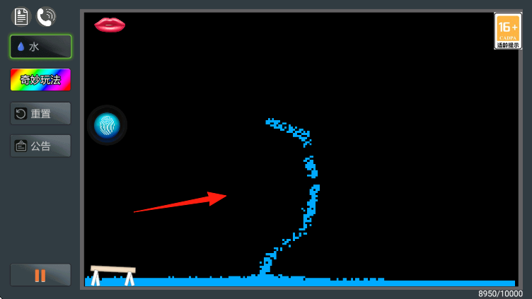 1、进入游戏界面,点击左侧【水】按钮,在黑色背景区域释放水流,观察水流的运动轨迹。