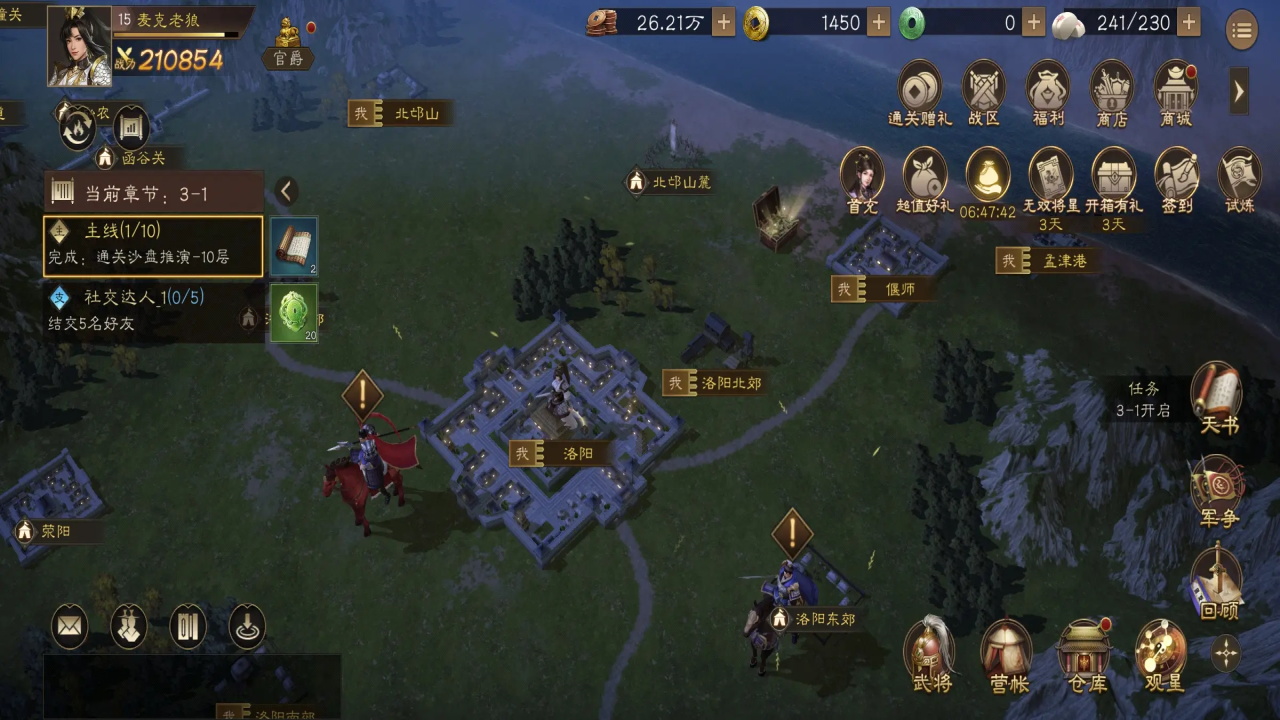 1、挑战主线关卡,体验经典三国故事。点击左边主线栏,可自动寻路前往对应关卡位置。