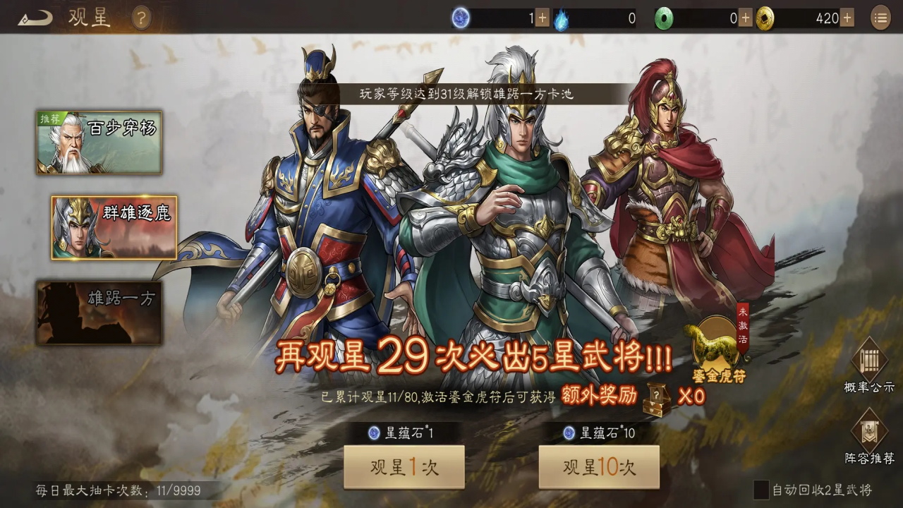 2、获取三国将星,与历史名将一起证战三国。游戏中使用星蕴石等道具,即可进行观星。