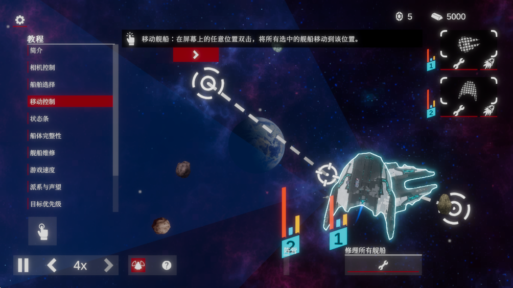 4.在屏幕上的任意位置双击,将所有选中的舰船移动到该位置,或者按住一艘舰船,然后拖动手指到目标位置,将该舰船移动过去。